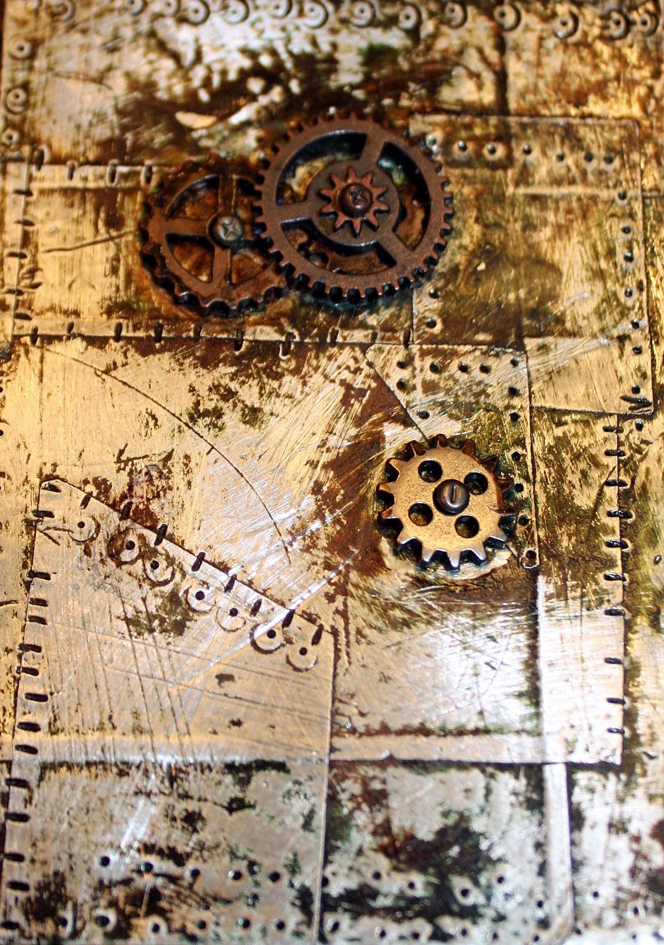 Ranger metal tape sheet, Adirondack Ink, various tools, Tim Holtz mini gears.
