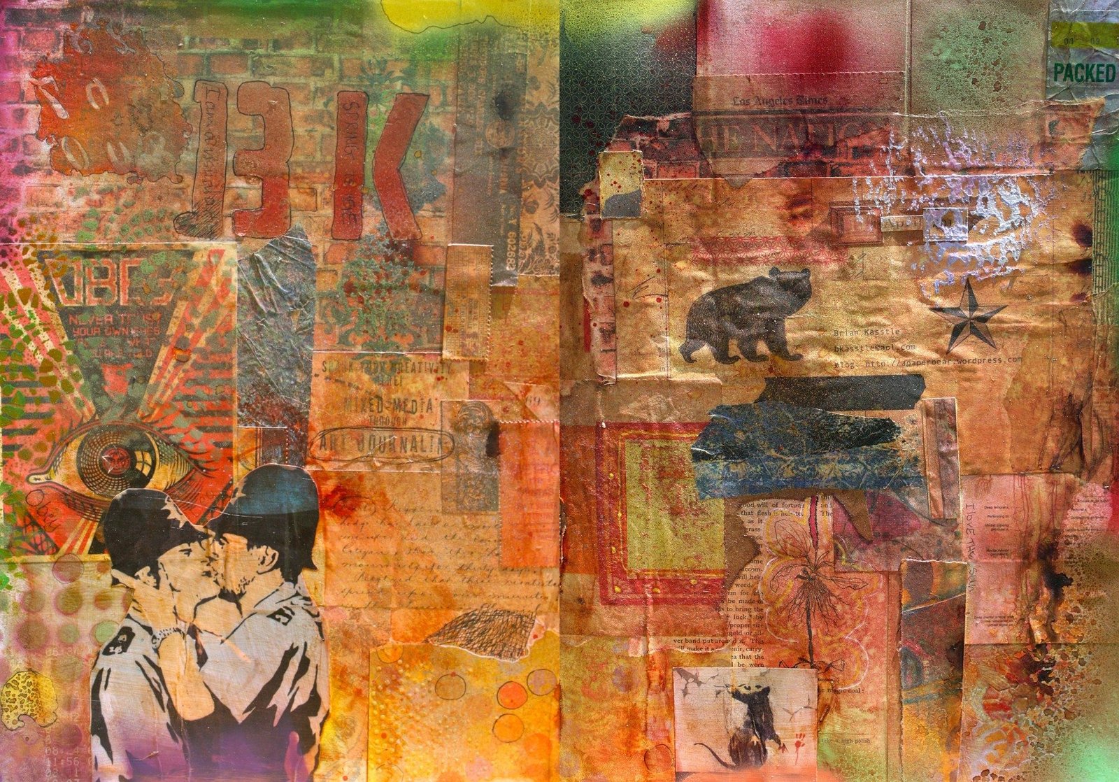 I am inspired by graffiti.  Is it art?  Is it tagging?  Is it social commentary?  Who is to say?  Check out the “Art in the Streets” exhibit at MOCA in Los Angeles.  It is amazing.  This is my Personal Graffiti.  The first spread in my XL Moleskine 11.5 X 16.5 Volume 2.  Started 13 April 2011.  I reserve the right to add and obliterate this spread… it is my Personal Graffiti, subject to my moods and whims…  Go graffiti in your journal… Go ahead… who needs permission?