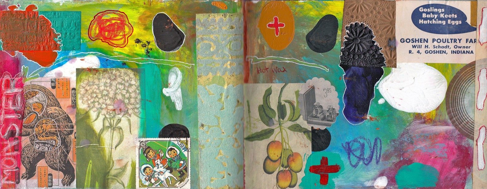 Vintage and personal images, acrylic paint, ink, poster paint pens & black and white gel pens.