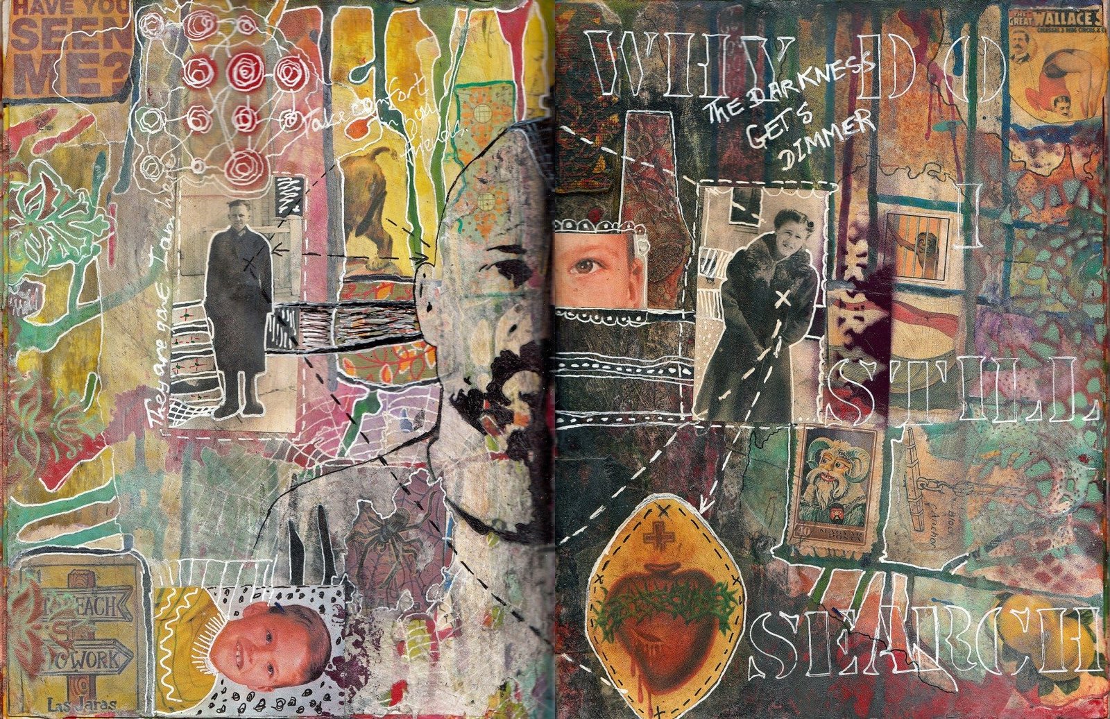 Vintage and personal images and papers, acrylic paint, Montana spray paints, Sigano white gel pen, black gel pen, black and white gesso.