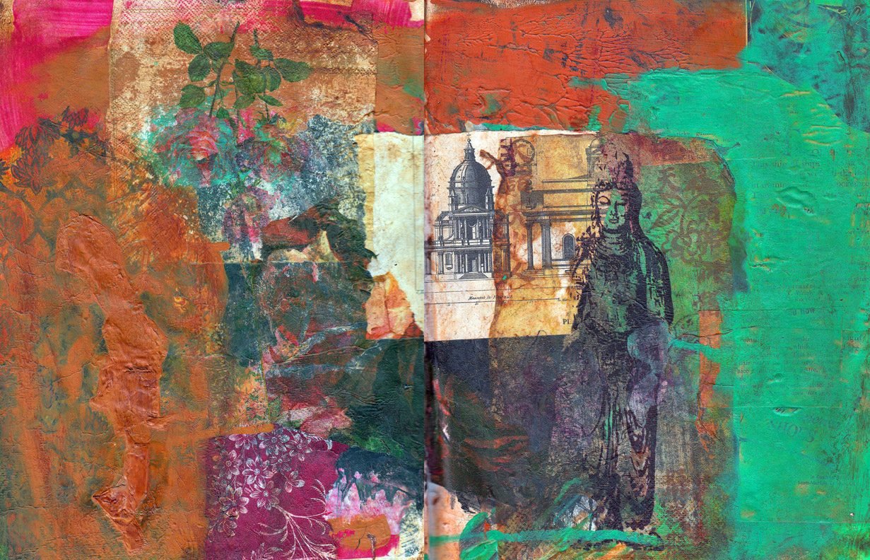 Vintage and personal images, napkins, acrylic paint, matte medium, Tim Holtz Distress Ink, matte varnish.