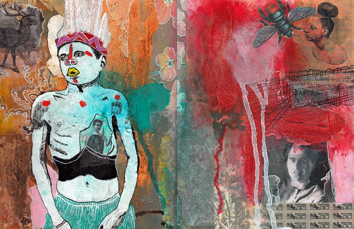 Vintage and personal images, found papers, tracing papers images, wallpapers, Nova Color paints, white gesso, Adirondack Spray Inks, matt medium, Sigano white gel pen, Micron black pen, Sharpie paint pens.