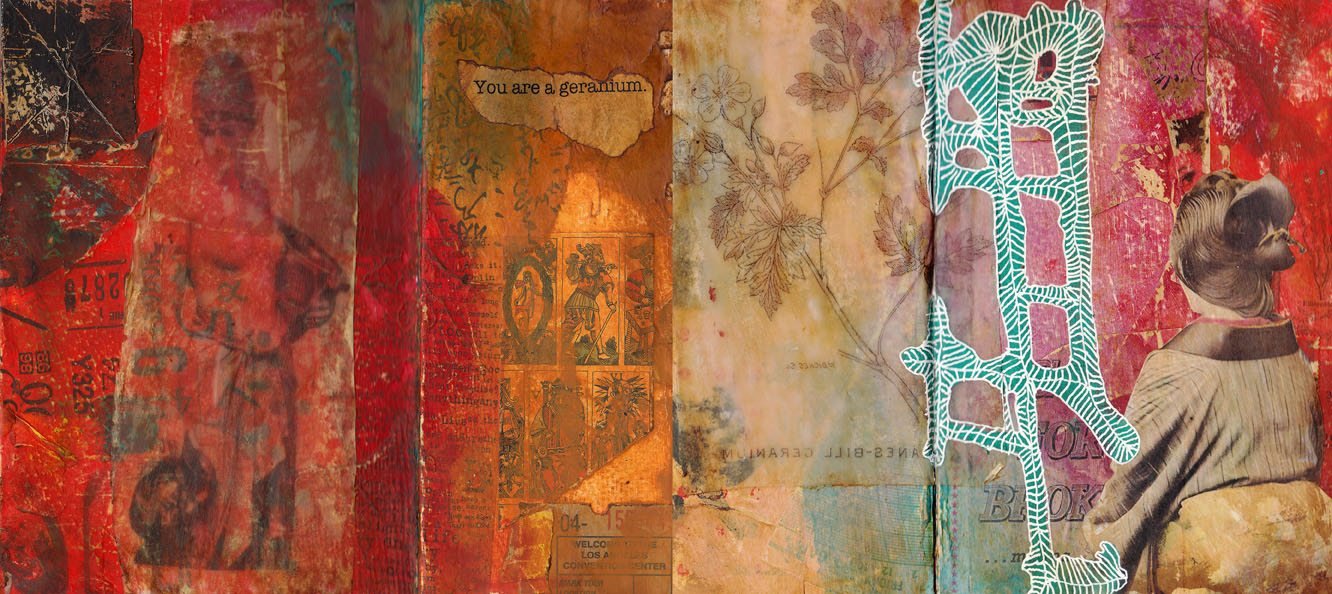 Vintage & found papers, Nova Color paint, matte medium, gel skin image transfers, Sigano white gel pen. Distress Ink, matte varnish.
