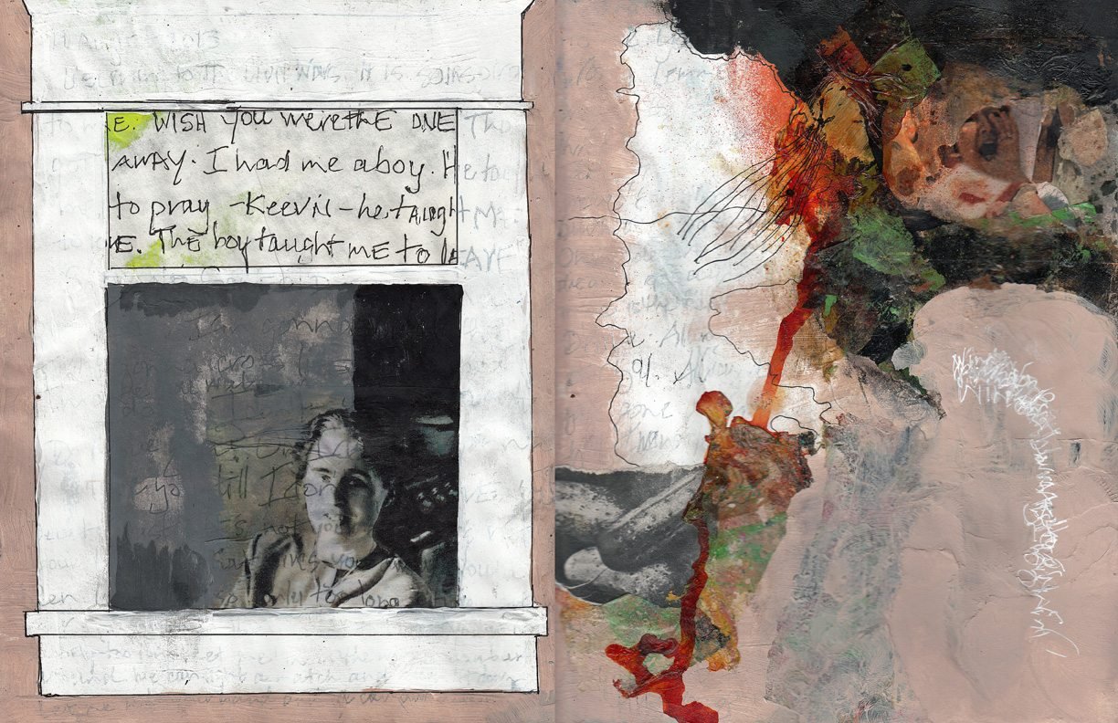 White gesso, Nova Color acrylic paints, image printed on tracing paper, vintage papers, and found materials, Sigano white gel pen, Adirondack Sprays.