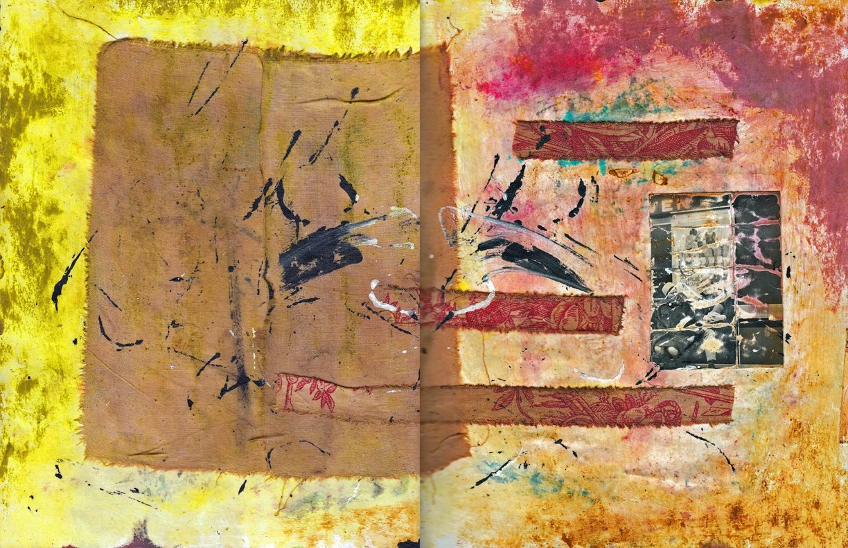 Vintage papers and images & cloth, Nova color acrylic paint, black and white gesso.