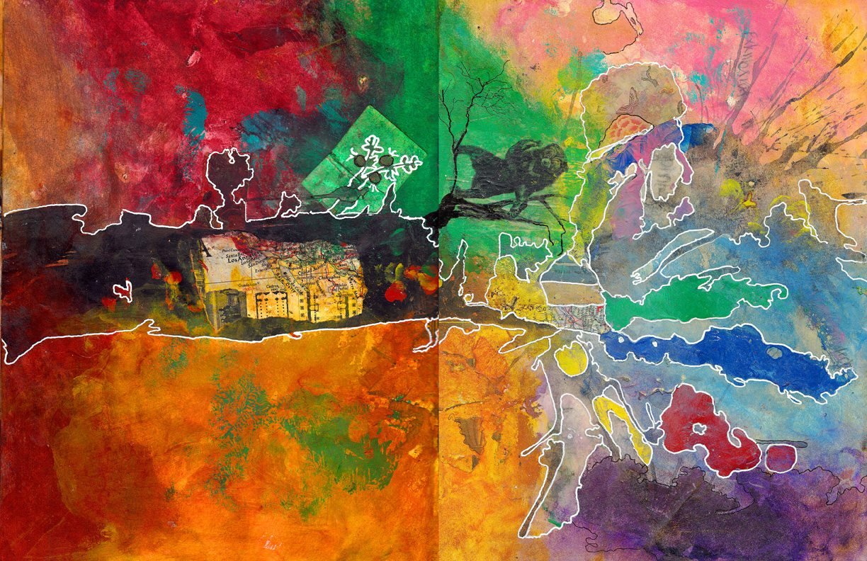 Black gesso, Nova Color acrylic paint, matte medium, handmade papers, Sigano white gel pen, black Micron pen, tracing paper image.