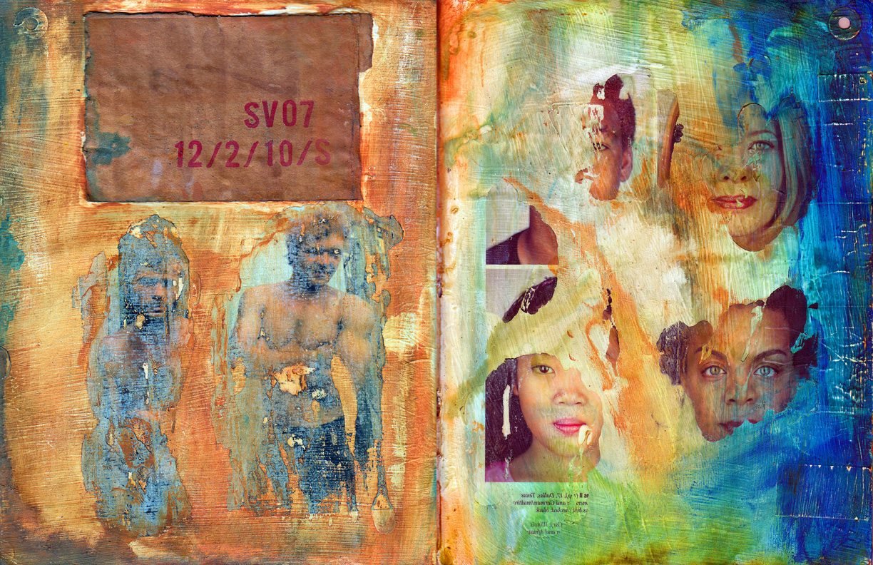 Nova Color paints, image transfers with matte gel, matte medium, cardboard, matte varnish, Tim Holtz Distress Inks.
