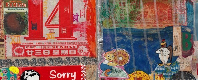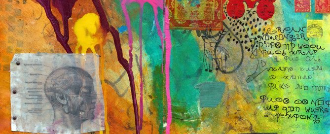 Spread 215 - "Been Waiting" 15 - 22 April 2015 Vintage and personal images, Nova Color paints, matte varnish, tracing paper transfers, pencil, Micron pen, Sigano white gel pen. I waited so long. Finally. This spread was created with Terry Garrett and Thomas LaBadia playing the journaling game. So much fun sharing together.